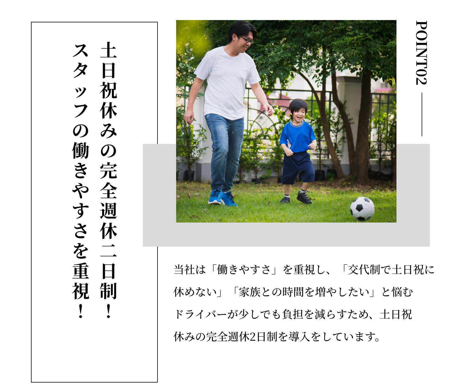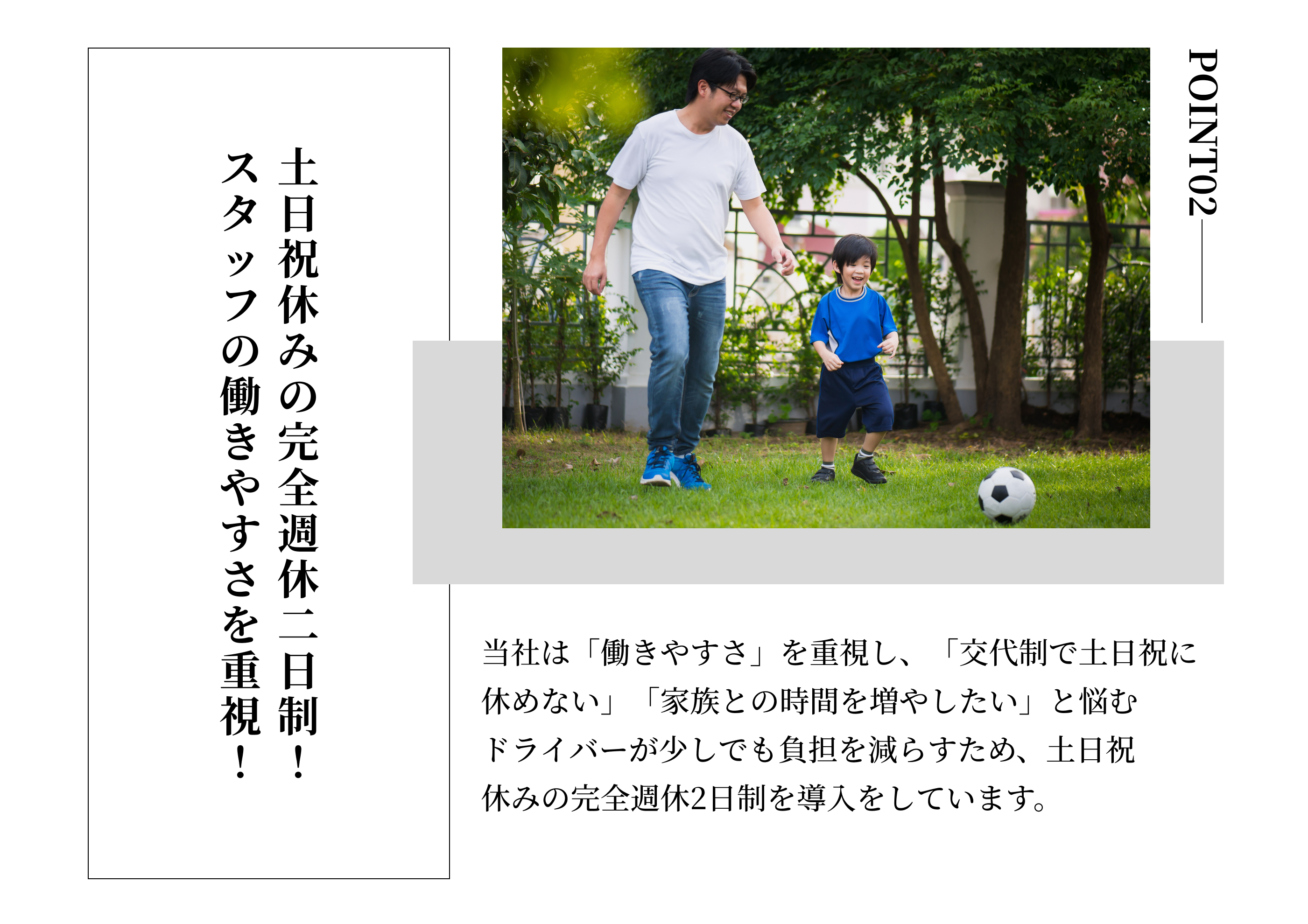 完全週休2日制 土日祝休み ※稼ぎたい方は土曜日出勤も相談可能! ◇休暇 夏季休暇/年末年始休暇/有給休暇/慶弔休暇 |