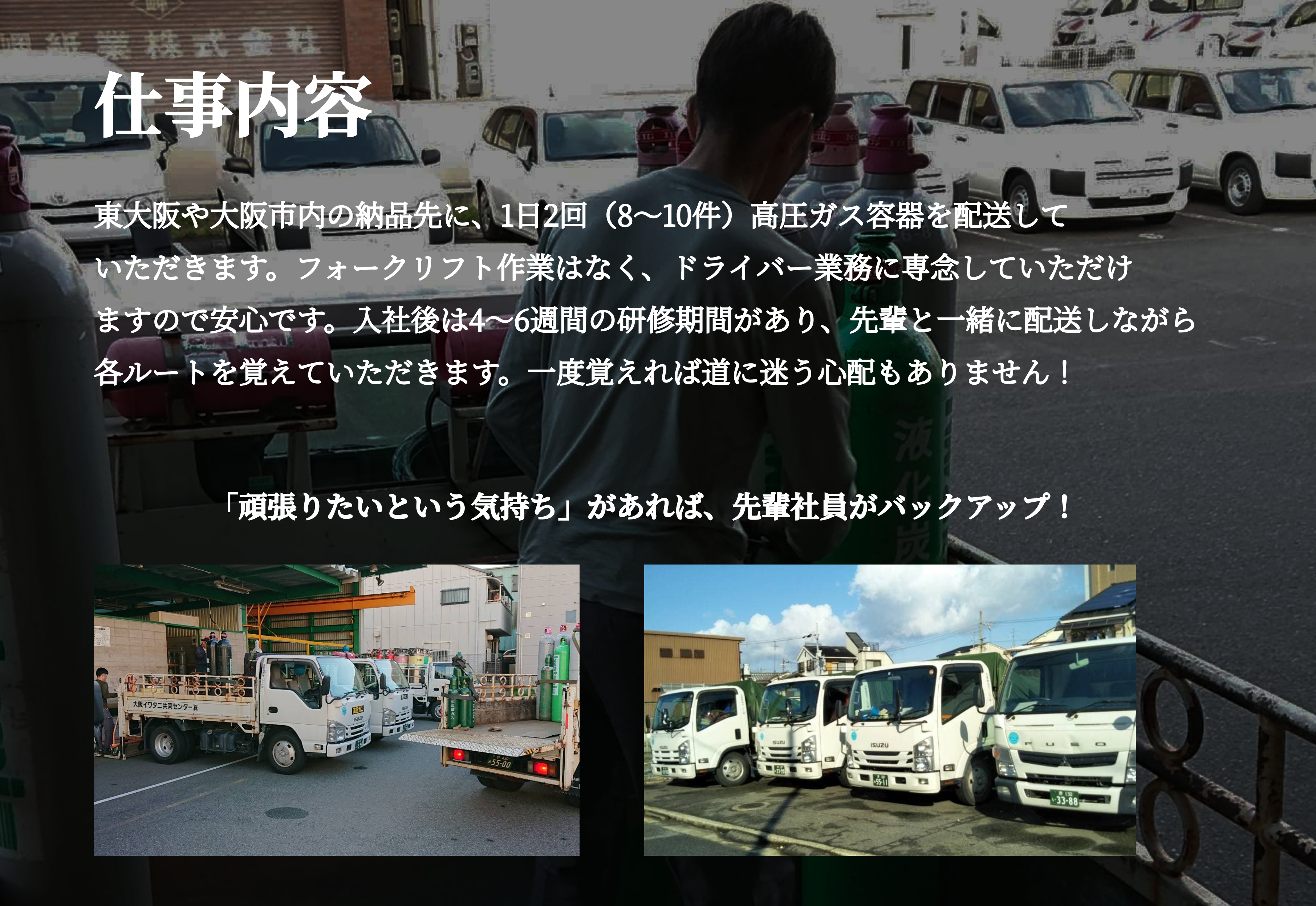 取引先の方に「いつも重たいボンベを運んでくれてありがとう」と温かい言葉をかけられた時、やりがいを感じていただけます!
