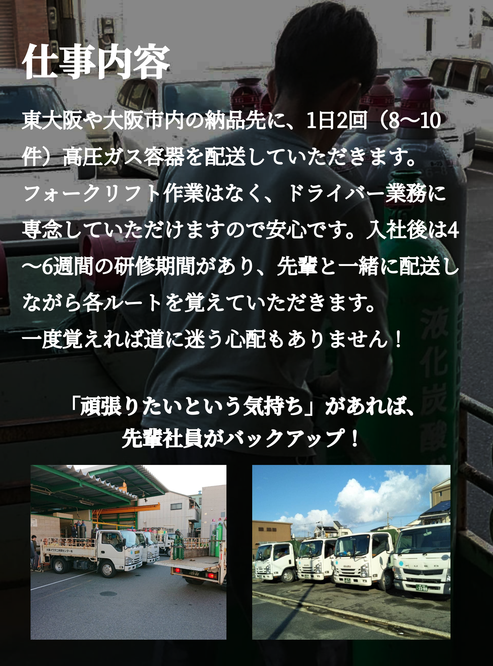東大阪、大阪市内の納品先に高圧ガス容器を1日2回(8~10件)を配送 現地でのフォークリフト作業などはなし!ドライバー&積み下ろし業務に専念にすることが可能◎ |